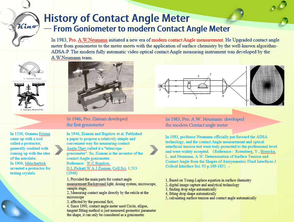 In 1983, Pro. A.W.Neumann initiated a new era of modern contact Angle measurement. He Upgraded contact angle meter from goniometer to the meter meets with the application of surface chemistry by the well-known algorithm- ADSA-P. The modern fully automatic video optical contact Angle measuring instrument was developed by the A.W.Neumann team.