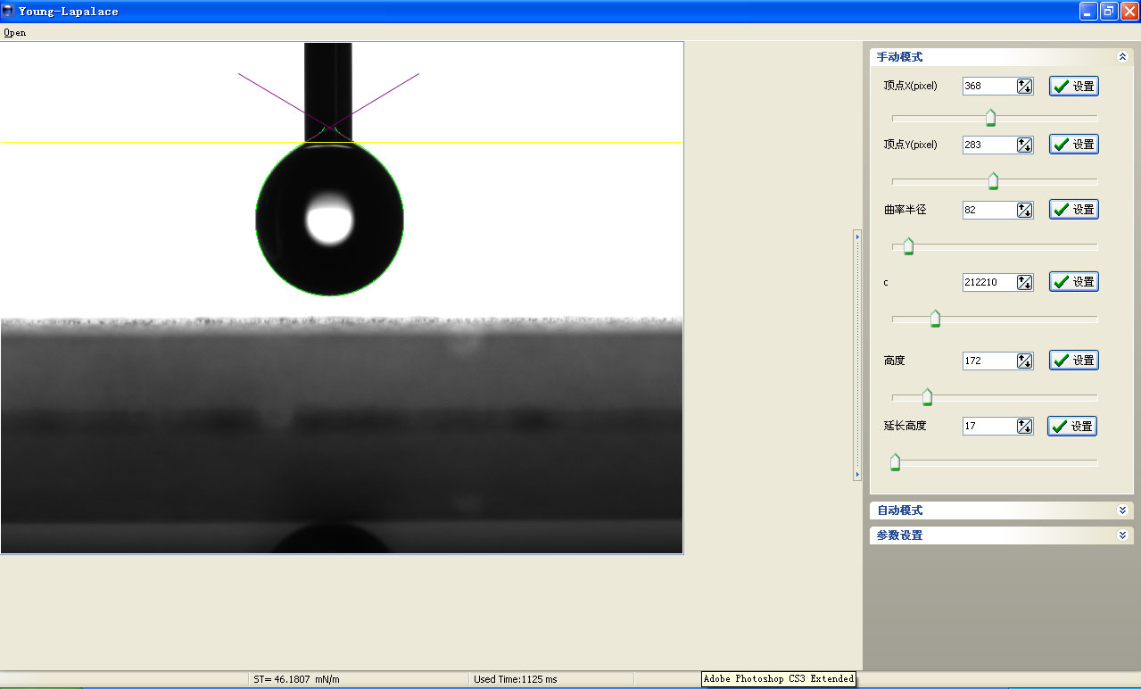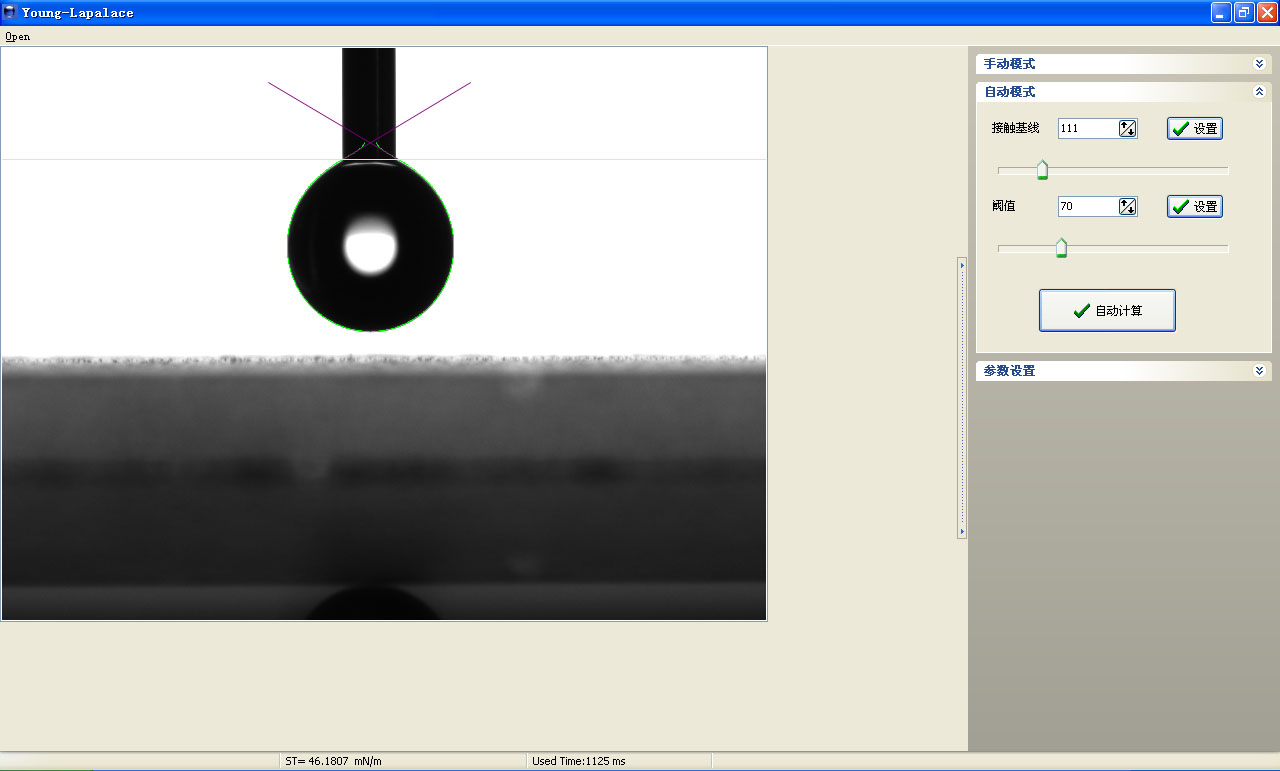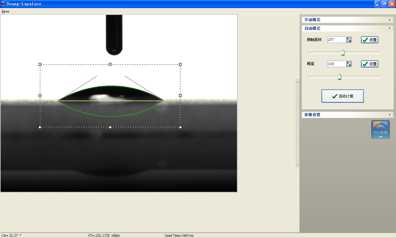 软件自动拟合边缘,计算出表面张力值,接触角值等参数,并显示在软件下方的提示栏中。