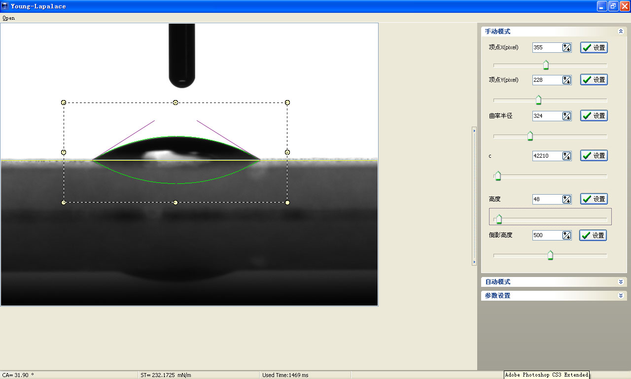 (2)调整曲率半径,让Young-lapalace曲线拟合到液滴上去;