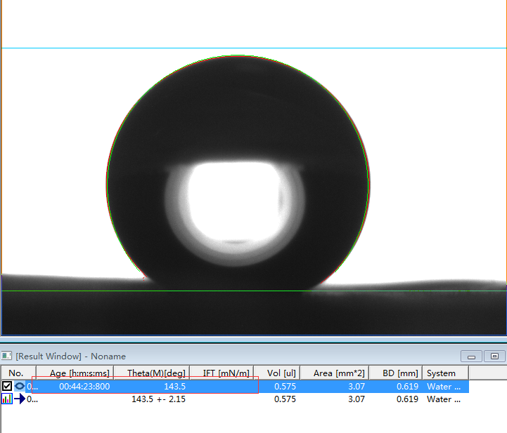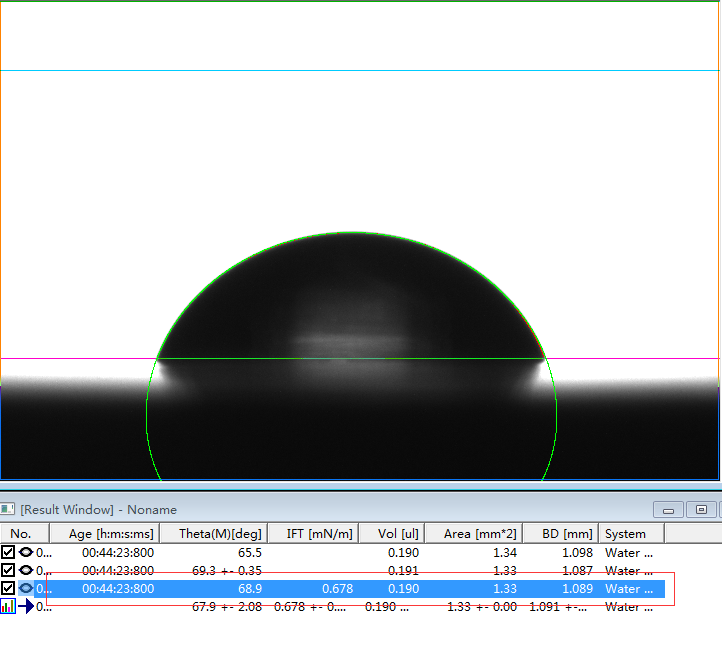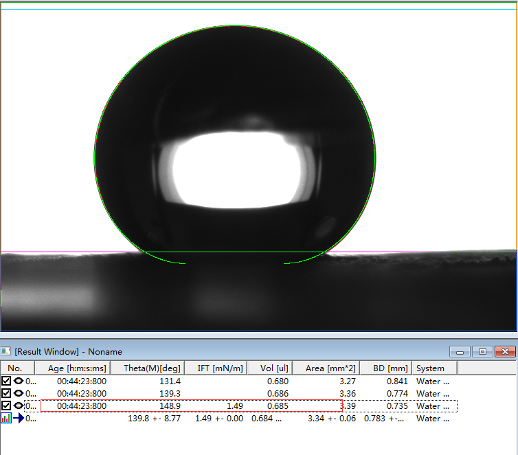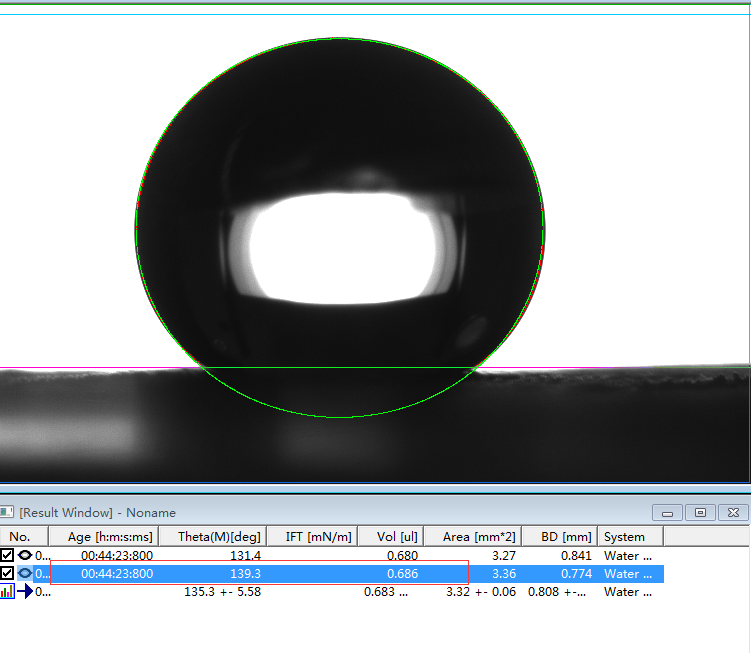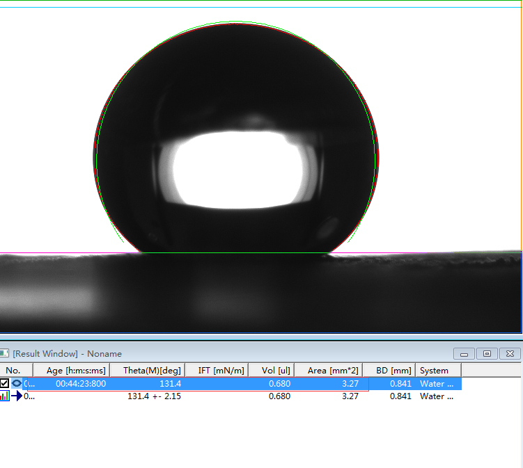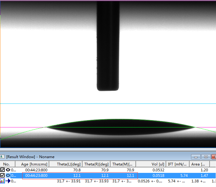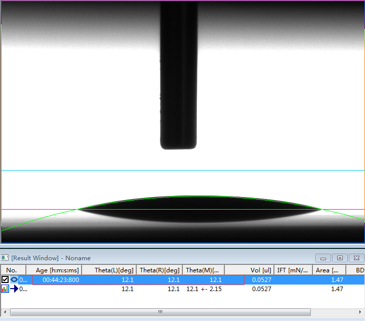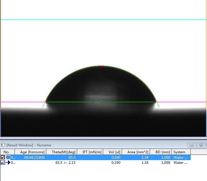2、专业的接触角测量仪,或者真正的接触角测量仪必须是建议在Young-Laplace方程拟合的基础上的。判断是否采用了Young-Laplace方程拟合算法的方法非常简单,将如上第1、6和第7行的第一张图片下载下来后,分析其接触角值。如果能够实现边缘拟合度好,且出现接近我们公示的角度值且能够出现相应的表面张力值时,则说明该软件采用了Young-Laplace方程拟合算法,否则极可能是采用椭圆拟合的假Young-Laplace方程拟合算法。
