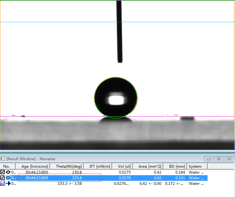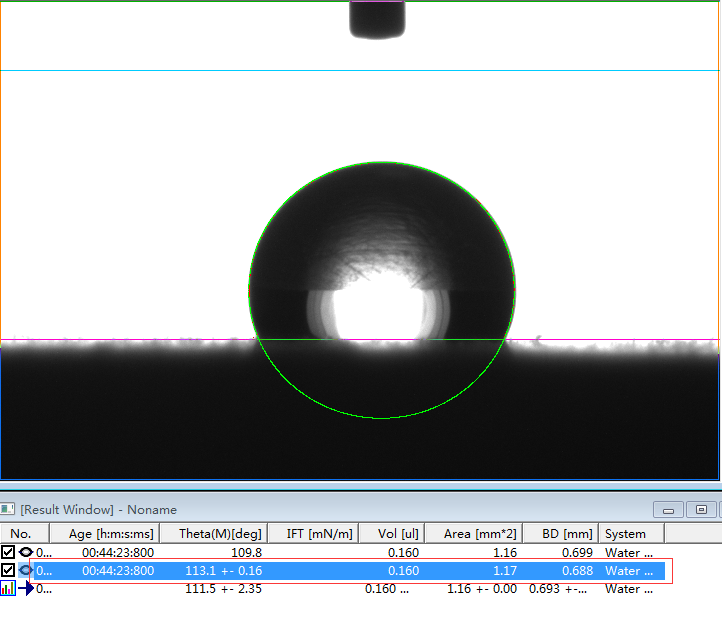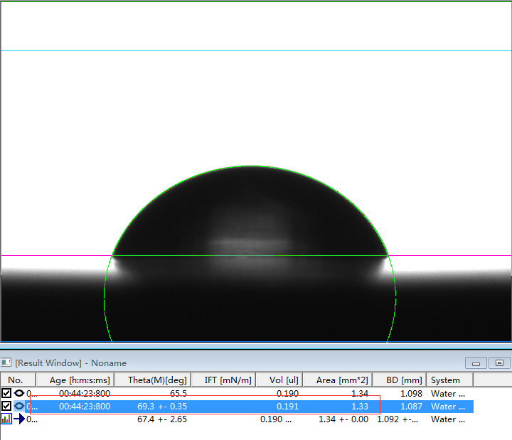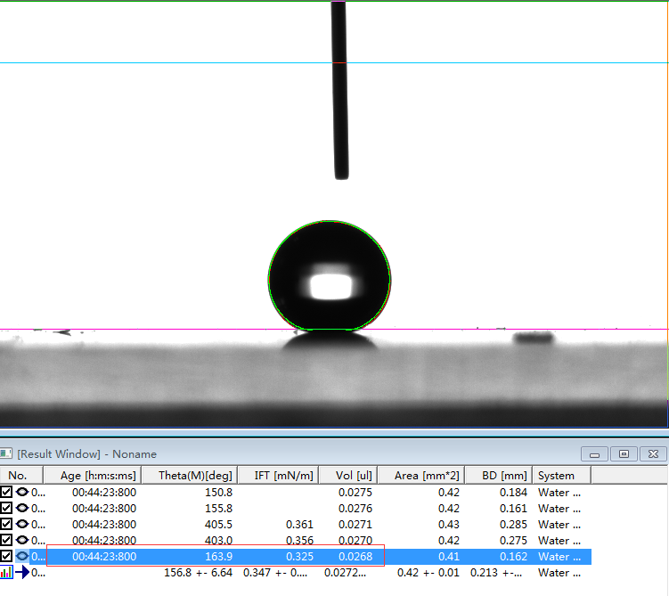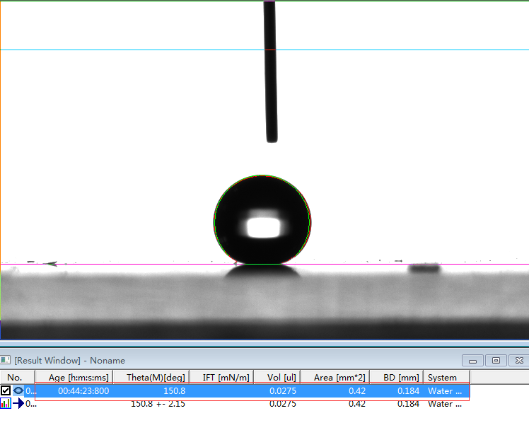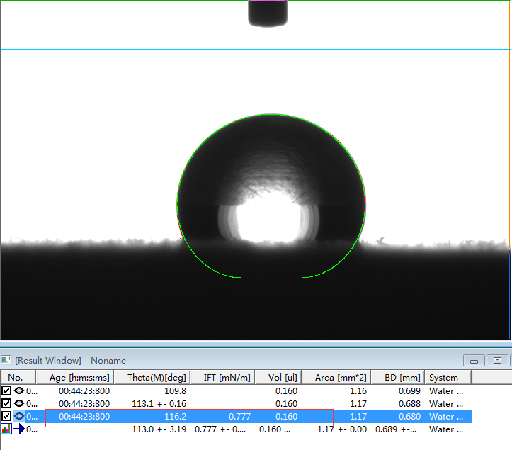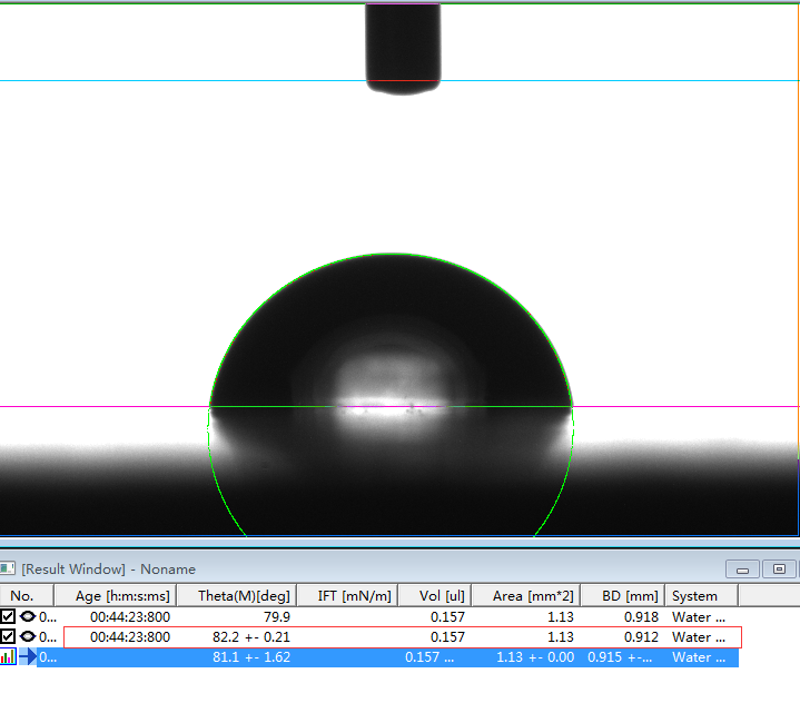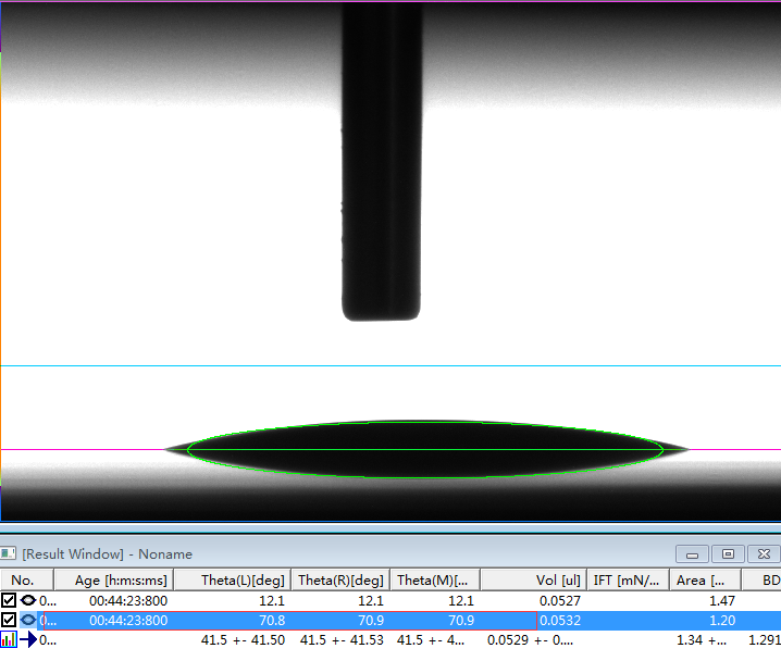2、专业的接触角测量仪,或者真正的接触角测量仪必须是建议在Young-Laplace方程拟合的基础上的。判断是否采用了Young-Laplace方程拟合算法的方法非常简单,将如上第1、6和第7行的第一张图片下载下来后,分析其接触角值。如果能够实现边缘拟合度好,且出现接近我们公示的角度值且能够出现相应的表面张力值时,则说明该软件采用了Young-Laplace方程拟合算法,否则极可能是采用椭圆拟合的假Young-Laplace方程拟合算法。